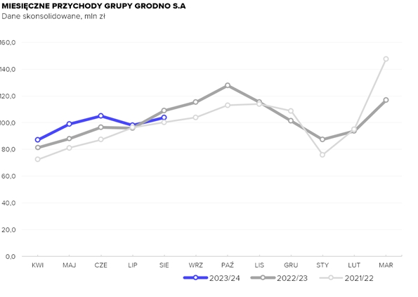 Zgodnie z szacunkami, w sierpniu skonsolidowane przychody Grodna wyniosły 103,8 mln zł i były niższe o 4,6% rdr. Narastająco po pięciu miesiącach bieżącego roku obrotowego Grupa odnotowała sprzedaż na poziomie 492,6 mln zł, co oznacza wzrost o 4,5% rdr.