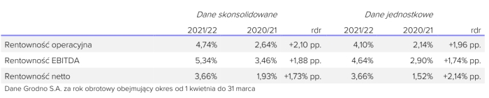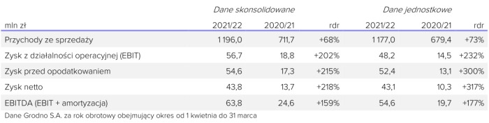 Grupa Grodno potwierdziła wcześniejsze szacunki, raportując najlepsze wyniki roczne w swojej historii. W zakończonym w marcu roku obrotowym 2021/22 wypracowała 1,2 mld zł przychodów (+68% rdr), 63,8 mln zł EBITDA (+159% rdr) oraz 43,8 mln zysku netto (+218% rdr), istotnie zwiększając rentowność. W ocenie Zarządu, bieżący rok może być kolejnym rekordowym.