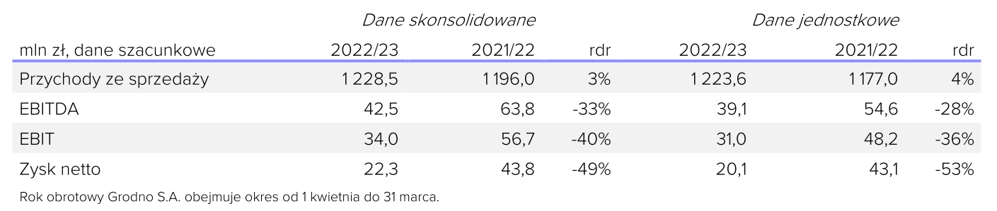 Zgodnie z szacunkami, w zakończonym w marcu roku obrotowym 2022/23, Grodno wypracowało 1,2 mld zł przychodów, które przełożyły się na 42,5 mln zł EBITDA, 34,0 mln zł EBIT oraz 22,3 mln zł zysku netto. Oznacza to rekordowy poziom sprzedaży, odnotowany przy jednoczesnym spadku pozycji wynikowych pod wpływem wyższych kosztów i presji konkurencyjnej.