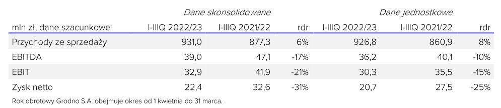 Grodno szacuje 931 mln zł przychodów i 22,4 mln zł zysku netto po trzech kwartałach 2022/23