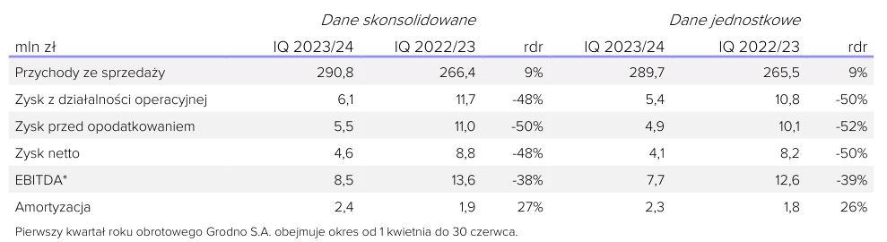 Pozycje wynikowe Grodna w pierwszym kwartale 2023/24 kształtowały się na niższych rdr poziomach, pozostając pod wpływem pogorszenia sytuacji rynkowej.