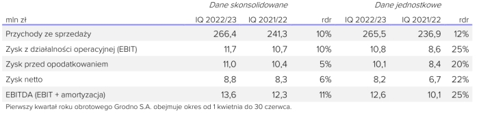Zgodnie z najnowszym raportem okresowym, skonsolidowane przychody Grodna w miesiącach kwiecień - czerwiec wyniosły 266,4 mln zł i przełożyły się na 13,6 mln zł EBITDA, 11,7 mln zł zysku operacyjnego i 8,8 mln zł zysku netto. Historycznie były to najwyższe wyniki odnotowane przez Grupę za ten okres roku.