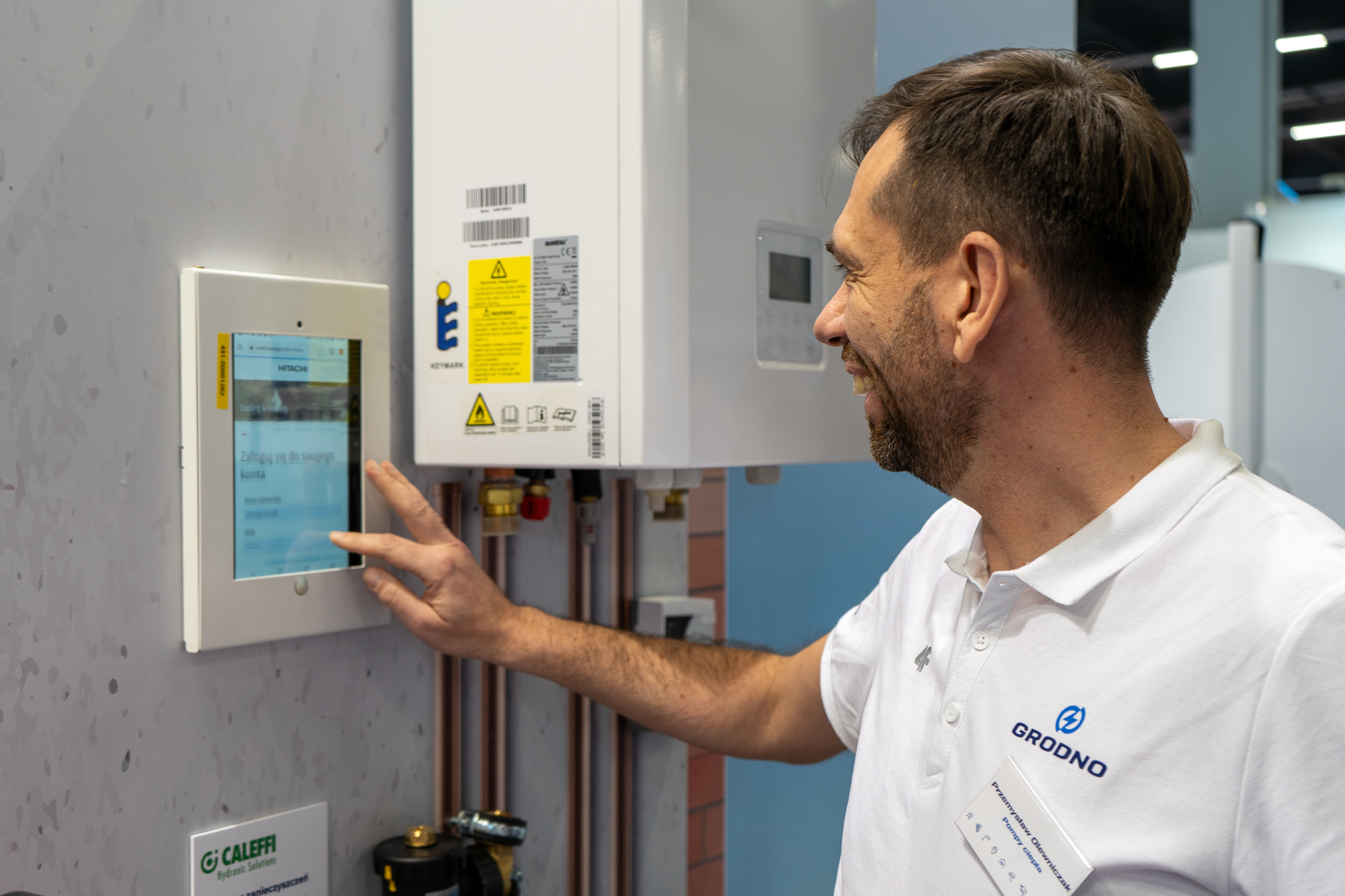 I rzeczywiście, na naszym stoisku było co podziwiać: były kotłownie z pompami ciepła Auratsu, robiąca wrażenie kaskada pomp Hitachi i dodatki hydrauliczne Solimpeks. Przyciągały oko ładowarki samochodowe firm Eway, Weidmüller, Fronius, Eaton, Solplanet i ETI Polam.