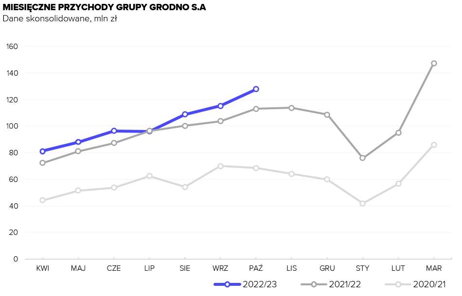 Zgodnie z najnowszymi szacunkami, w październiku skonsolidowane przychody Grodna wyniosły 127,9 mln zł, co oznacza wzrost o 13% rdr. Narastająco po siedmiu miesiącach bieżącego roku obrotowego Grupa wypracowała sprzedaż na poziomie 713,8 mln zł, czyli o 9% więcej rdr.