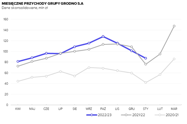 Ponad 1 mld zł przychodów narastająco za dziesięć miesięcy bieżącego roku obrotowego jest najlepszym rezultatem sprzedażowym za ten okres roku w historii firmy. Zarząd planuje utrzymanie dodatniej dynamiki wzrostu również w perspektywie całego roku obrotowego 2022/23, który Grodno zamknie z końcem marca.