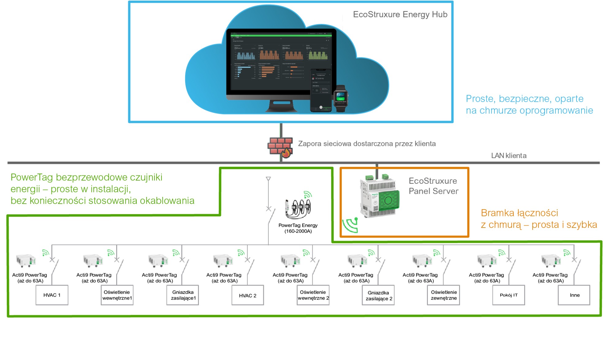 Dzięki prostym mechanizmom „przeciągnij i upuść” konfiguracja systemu jest niezwykle intuicyjna: wystarczy, że podłączysz się do infrastruktury energetycznej za pomocą bramki komunikacyjnej EcoStruxure Panel Server.