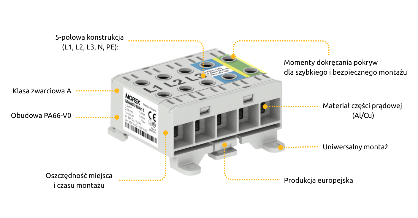 Seria 5-polowych złącz OTL MOREK została zaprojektowana, aby maksymalnie uprościć montaż i zarządzanie przestrzenią w rozdzielnicach i systemach zasilania. Jedno złącze OTL = komplet torów zasilających: L1, L2, L3, N oraz PE bez konieczności stosowania wielu pojedynczych złącz co czyni je kompletnym elementem rozdzielnicy.